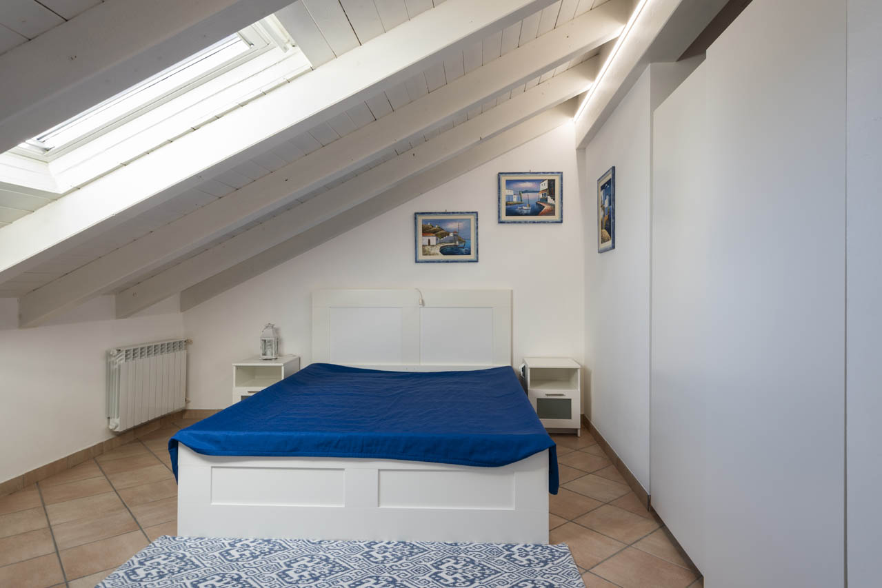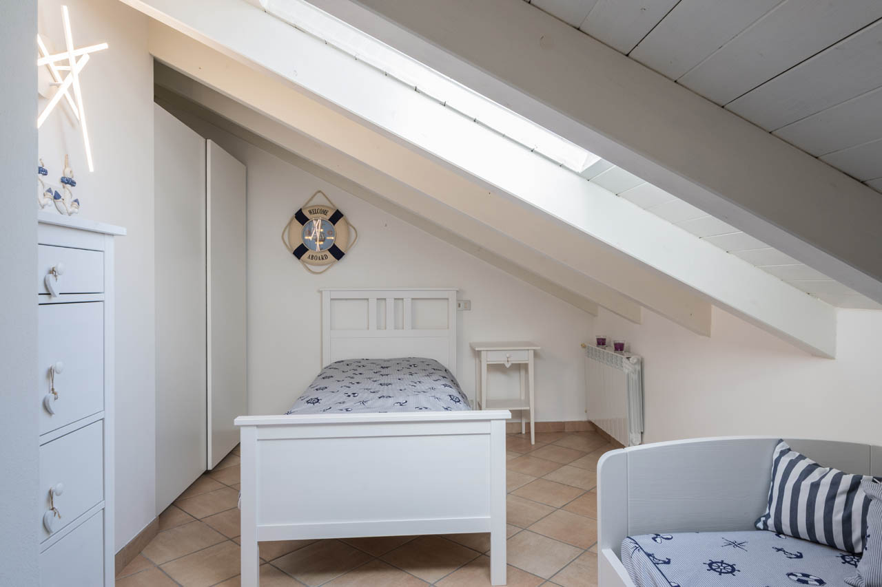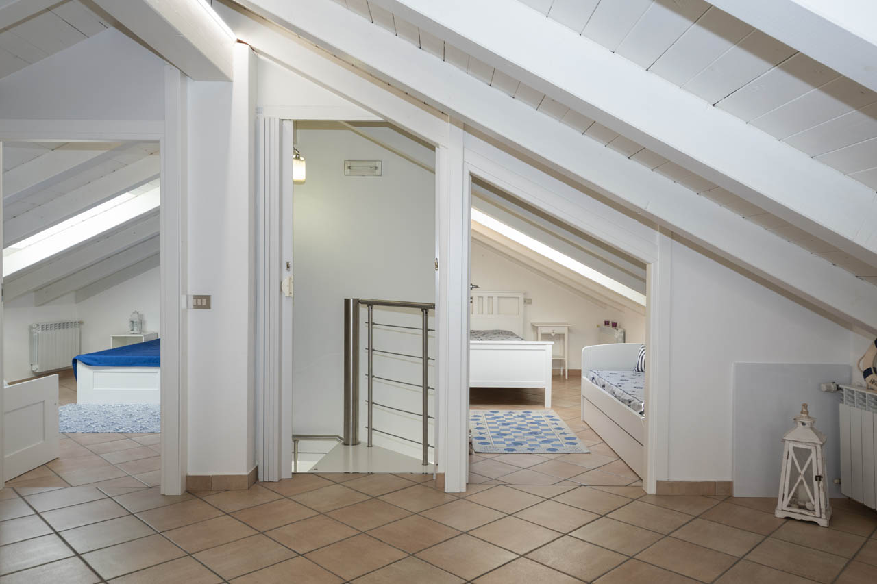 Il piano superiore, collegato da una scala a chiocciola, ospita due camere da letto, un secondo bagno finestrato con vasca e un pratico salottino.