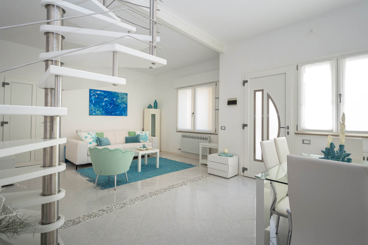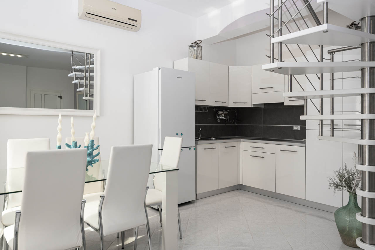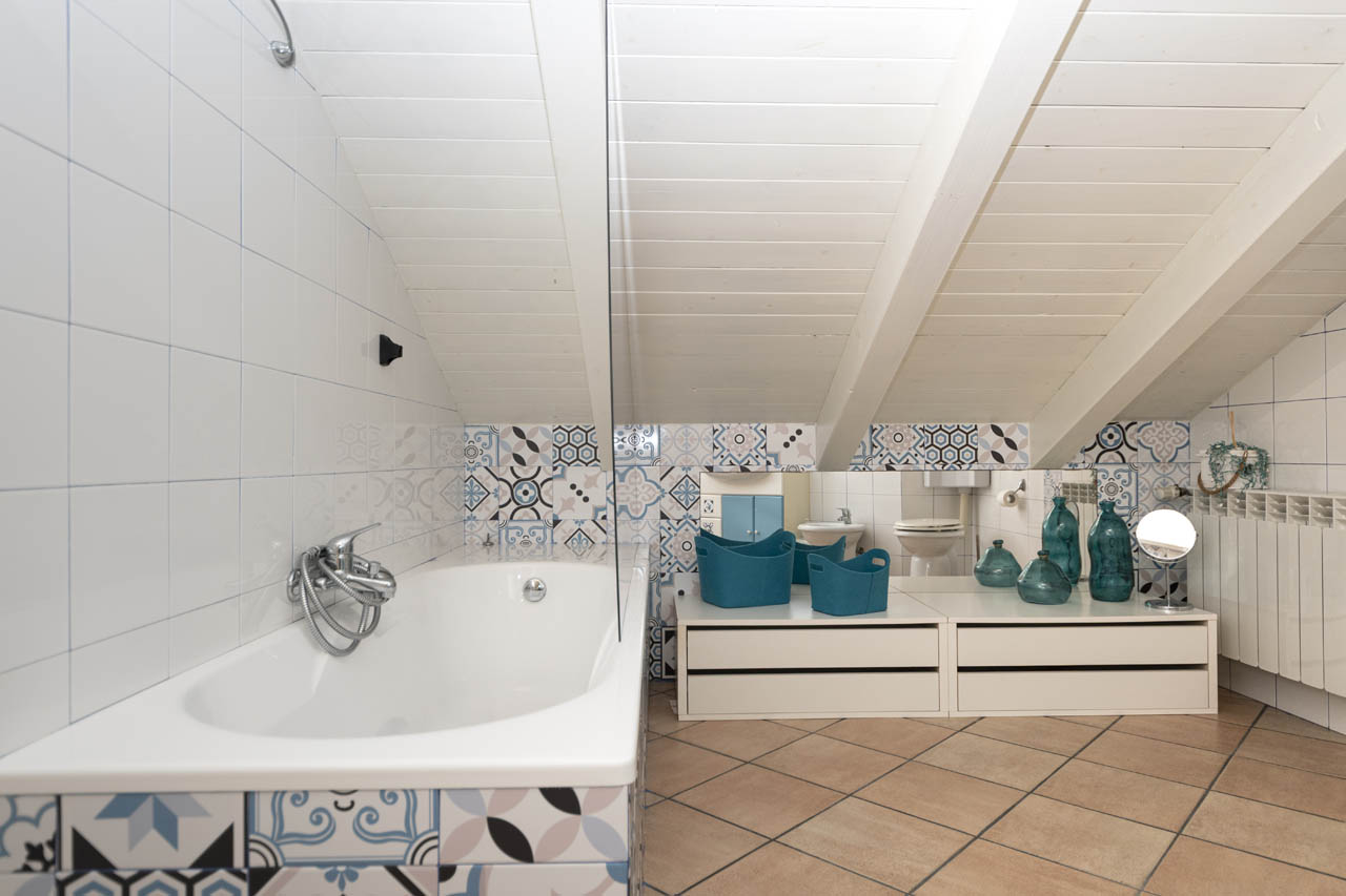Il piano superiore, collegato da una scala a chiocciola, ospita due camere da letto, un secondo bagno finestrato con vasca e un pratico salottino.