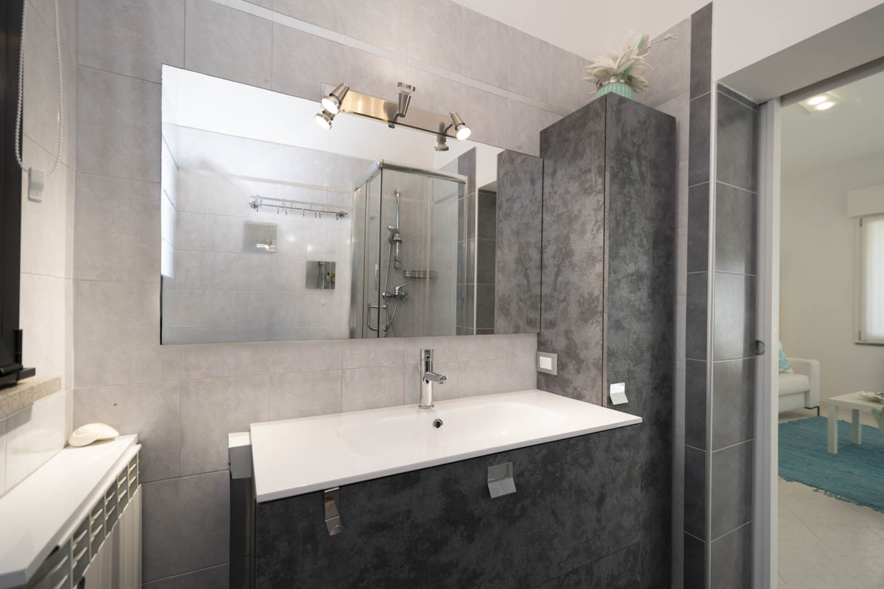 Al piano terra si trova una luminosa zona giorno con cucina a vista e un bagno finestrato completo di box doccia.