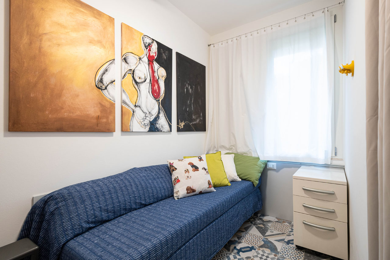 La zona notte comprende una camera matrimoniale, una camera singola e un bagno finestrato. Un soppalco ad uso accessorio, ben inserito nel contesto dell’abitazione, rappresenta uno spazio pratico da destinare a ripostiglio o deposito, utile per ottimizzare la vivibilità degli ambienti principali.