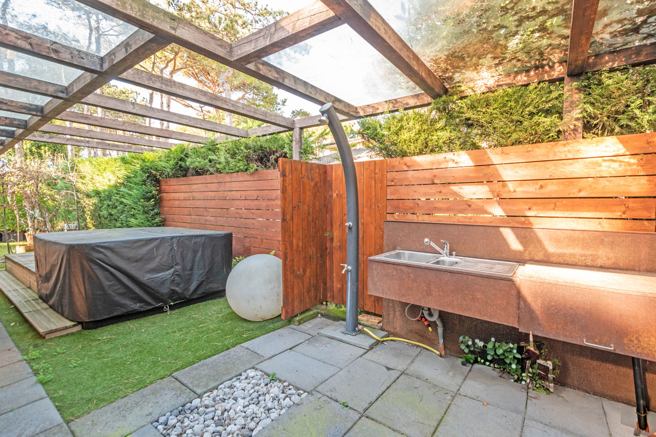 All’esterno, lo scoperto privato di circa 120 mq si configura come una vera estensione della casa: area idromassaggio, cucina esterna, zone verdi curate e spazi pensati per vivere la bella stagione in totale tranquillità.
